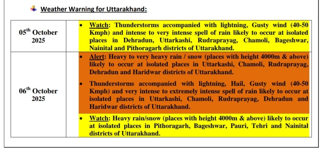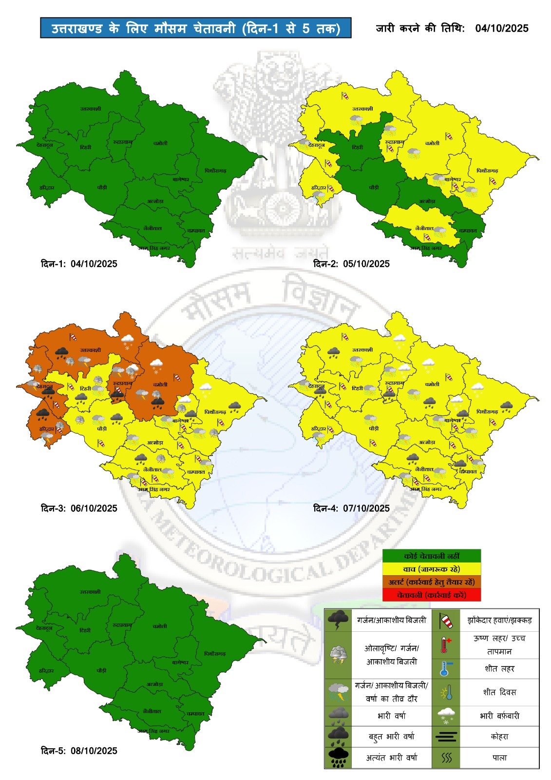 हरिद्वार। 06 अक्टूबर को उत्तराखंड के कुछ जनपदों में भारी बारिश एवं पहाड़ी क्षेत्रों में बर्फबारी की चेतावनी जारी की गई है। जनपद हरिद्वार की बात करें 06 अक्टूबर को भारी बारिश का ऑरेंज अलर्ट जारी किया गया है।