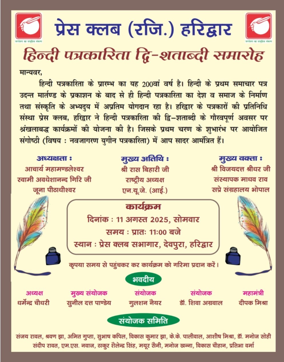 हरिद्वार। हिंदी पत्रकारिता के 200वें वर्ष में प्रवेश करने पर पत्रकारों की सम्मानित संस्था प्रेस क्लब (रजि.) हरिद्वार 11 अगस्त से एक व्याख्यानमाला का आयोजन करने जा रहा है। कल उद्घाटन सत्र में जाने माने वक्ता, चिंतक एवं विचारक कार्यक्रम को संबोधित करेंगे। सोमवार, 11 अगस्त 2025 को प्रेस क्लब (रजि.) हरिद्वार के सभागार में होने वाले कार्यक्रम की अध्यक्षता जूनापीठाधीश्वर आचार्य महामंडलेश्वर स्वामी अवधेशानंद गिरि महाराज करेंगे। वहीं मुख्य अतिथि के तौर पर एनयूजे, आई के राष्ट्रीय अध्यक्ष रास बिहारी एवं मुख्य वक्ता के तौर पर माधवराव सप्रे संग्रहालय, भोपाल के संस्थापक पद्मश्री विजय दत्त श्रीधर मौजूद रहेंगे।