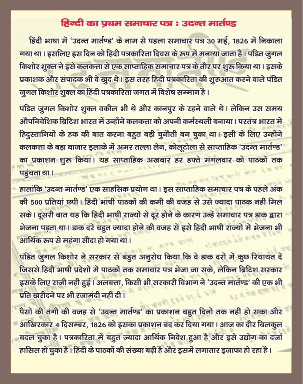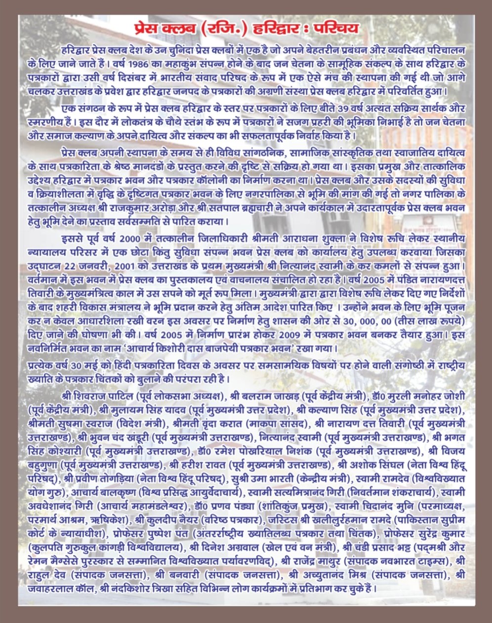 कार्यक्रम के मुख्य संयोजक सुनील दत्त पांडे ने बताया कि प्रेस क्लब हरिद्वार कई वर्षों से 30 मई को हिंदी पत्रकारिता दिवस का आयोजन करता है जिसमें देश के विद्वान लोगों को बुलाने की परंपरा रही है। प्रेस क्लब हरिद्वार हिंदी पत्रकारिता के 200 साल पूरे होने पर 30 मई 2026 को भव्य आयोजन करेगा। तब तक एक व्याख्या माला आयोजित की जाएगी जिसका उद्घाटन कार्यक्रम कल यानी 11 अगस्त को होगा। कार्यक्रम संयोजक गुलशन नैयर ने बताया कि 11 अगस्त के कार्यक्रम को लेकर सभी तैयारियां पूर्ण कर ली गई है। कार्यक्रम में महामंडलेश्वर स्वामी अवधेशानंद गिरी, पद्मश्री विजय दत्त श्रीधर एवं नेशनल यूनियन ऑफ जर्नलिस्ट्स इंडिया के राष्ट्रीय अध्यक्ष रास बिहारी प्रतिभाग करेंगे। प्रेस क्लब अध्यक्ष धर्मेंद्र चौधरी ने कहा कि कार्यकम भव्य एवं आकर्षक होगा जिसके लिए सभी तैयारियां पूर्ण कर ली गई हैं। संयोजक डॉ. शिवा अग्रवाल ने कहा कि इस तरह के कार्यक्रम का आयोजन गौरव की बात है। हिंदी पत्रकारिता ने आजादी दिलाने में महत्वपूर्ण भूमिका निभाई है और आज भी हिंदी के समाचारों का बड़ा पाठक वर्ग है। प्रेस क्लब के इतिहास में पहली बार शताब्दी समारोह मनाया जा रहा है। इसको लेकर पत्रकारों में भारी उत्साह है।