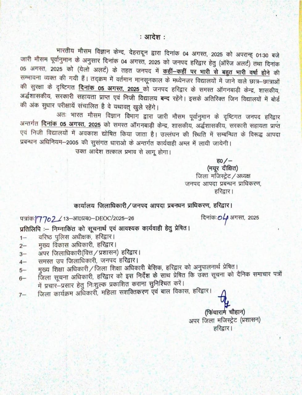 अतः भारत मौसम विज्ञान विभाग द्वारा जारी मौसम पूर्वानुमान के दृष्टिगत जनपद हरिद्वार अन्तर्गत दिनांक 05 अगस्त, 2025 को समस्त ऑगनबाड़ी केन्द्र, शासकीय, अर्द्धशासकीय, सरकारी सहायता प्राप्त एवं निजी विद्यालयों में अवकाश घोषित किया जाता है। उल्लंघन की स्थिति में सम्बन्धित के विरूद्ध आपदा प्रबन्धन अधिनियम-2005 की सुसंगत धाराओ के अन्तर्गत कार्यवाही अम्ल में लायी जायेगी। उन्होंने मुख्य शिकशिक्षा अधिकारी तथा जिला कार्यक्रम अधिकारी को आदेश का सख्ती से अनुपालन सुनिश्चित कराने के निर्देश दिए।