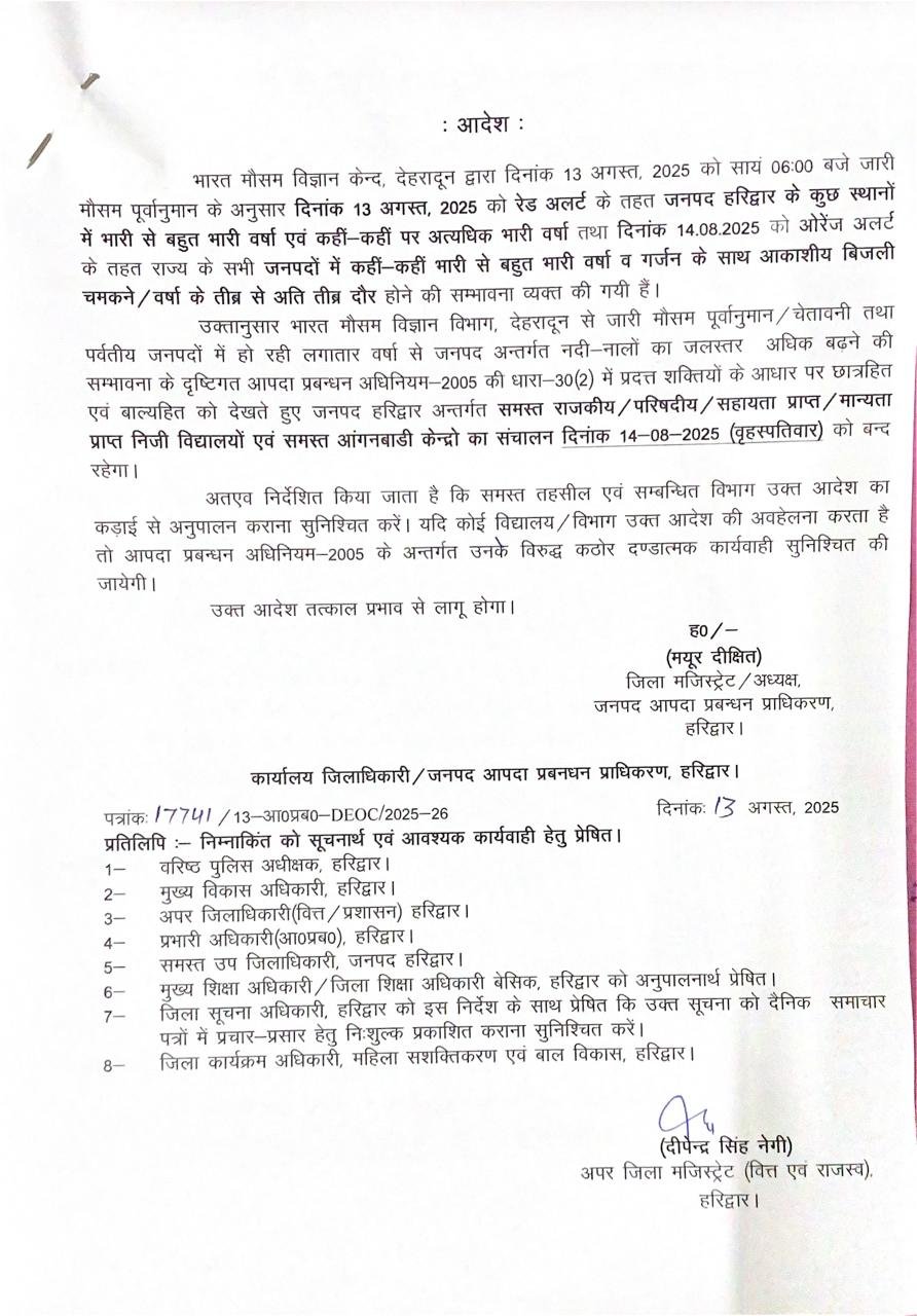 बारिश के अलर्ट के चलते कल अवकाश घोषित किया गया है। मौसम विभाग ने कल उत्तराखंड के जनपदों में भारी बारिश का अनुमान जताया है। जनपद हरिद्वार में ऑरेंज अलर्ट के चलते जिलाधिकारी मयूर दीक्षित ने अवकाश घोषित किया है।