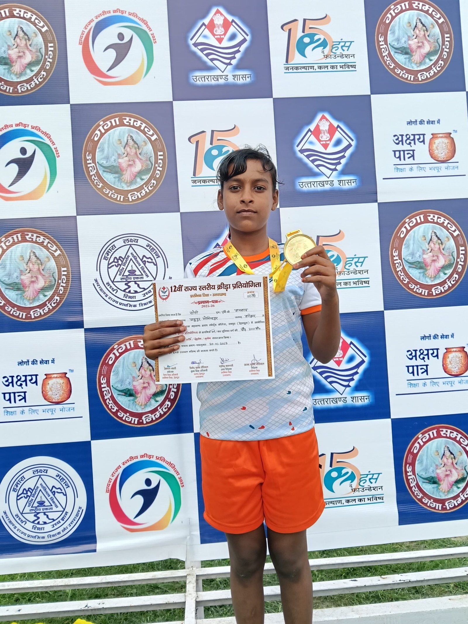 विदित हो कि देहरादून के रायपुर स्थित महाराणा प्रताप स्पोर्ट्स स्टेडियम में इन दिनों प्रदेश स्तरीय क्रीड़ा प्रतियोगिता का आयोजन किया जा रहा है। आज आयोजित प्रतिस्पर्धा में तेज रफ्तार से अपने प्रतिद्वंदियों को पछाड़ते हुए 200 मीटर दौड़ में राजकीय प्राथमिक विद्यालय दादूपुर गोविंदपुर की छात्रा सोनी ने अपना शानदार प्रदर्शन बरकरार रखा तथा प्रथम स्थान प्राप्त कर गोल्ड मैडल जीता। राष्ट्रीय कन्या जूनियर हाई स्कूल बोंगला की छात्रा तनु ने ऊंची कूद में गोल्ड मेडल झटका। वहीं राजकीय प्राथमिक विद्यालय नवोदय नगर बहादराबाद के छात्र दीशु ने 100मी. में सिल्वर मैडल प्राप्त किया। खंड शिक्षा अधिकारी बहादराबाद बृजपाल सिंह राठौर ने खिलाड़ियों के प्रदर्शन पर शुभकामनाएं दी हैं।