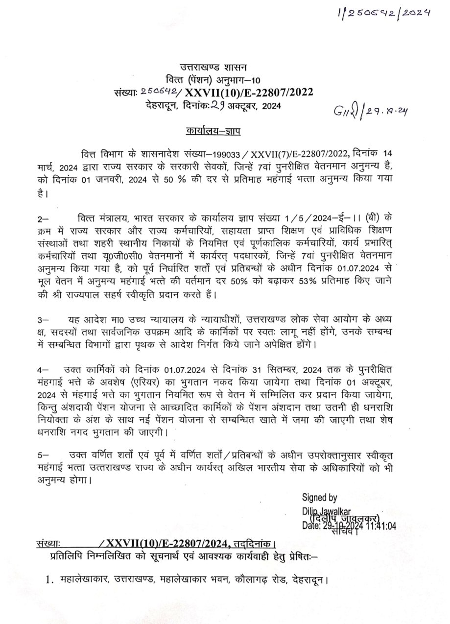 हरिद्वार। दीप पर्व से पहले कर्मचारियों को राहत देते हुए राज्य सरकार ने महंगाई भत्ता एवं तदर्थ बोनस की घोषणा कर दी है। अब 01 जुलाई से महंगाई भत्ता 53 फीसदी की दर से मिलेगा इसका साथ ही 7000 रुपये बोनस की भी घोषणा की गयी है। सचिव दिलीप जावलकर ने इस आशय का आदेश जारी कर दिया है।