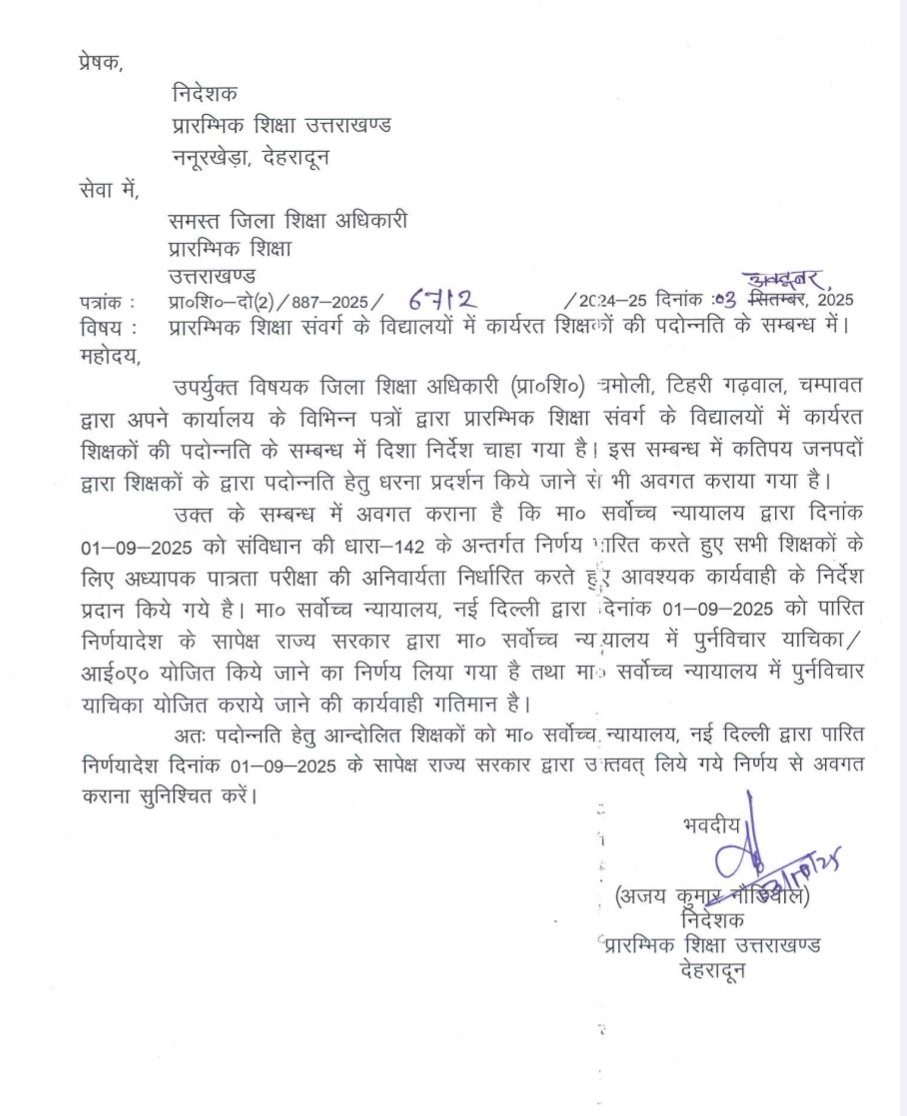 इस संदर्भ में आज निदेशक प्रारंभिक शिक्षा अजय नौडियाल ने स्थिति स्पष्ट कर दी है। जनपदों को प्रेषित पत्र में कहा गया कि मा. सर्वोच्च न्यायालय द्वारा दिनांक 01-09-2025 को संविधान की धारा-142 के अन्तर्गत निर्णय पारित करते हुए सभी शिक्षकों के लिए अध्यापक पात्रता परीक्षा की अनिवार्यता निर्धारित करते हुए आवश्यक कार्यवाही के निर्देश प्रदान किये थे। पारित निर्णयादेश के सापेक्ष राज्य सरकार द्वारा मा. सर्वोच्च न्यायालय में पुर्नविचार याचिका योजित किये जाने का निर्णय लिया गया है तथा मा. सर्वोच्च न्यायालय में पुर्नविचार याचिका योजित कराये जाने की कार्यवाही गतिमान है। इस कारण अगले निर्णय तक प्रमोशन नहीं किया जा सकेंगे।