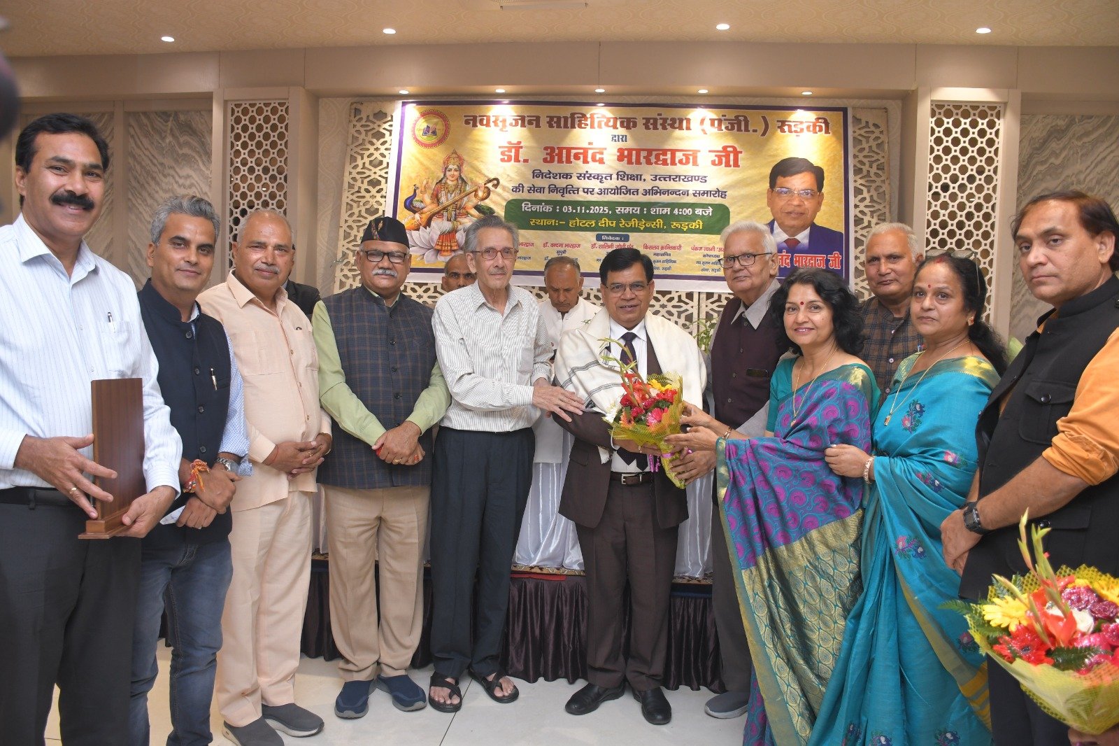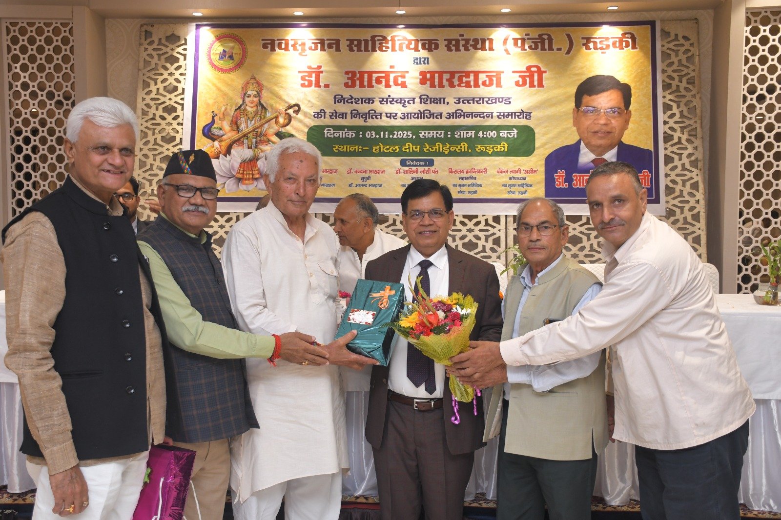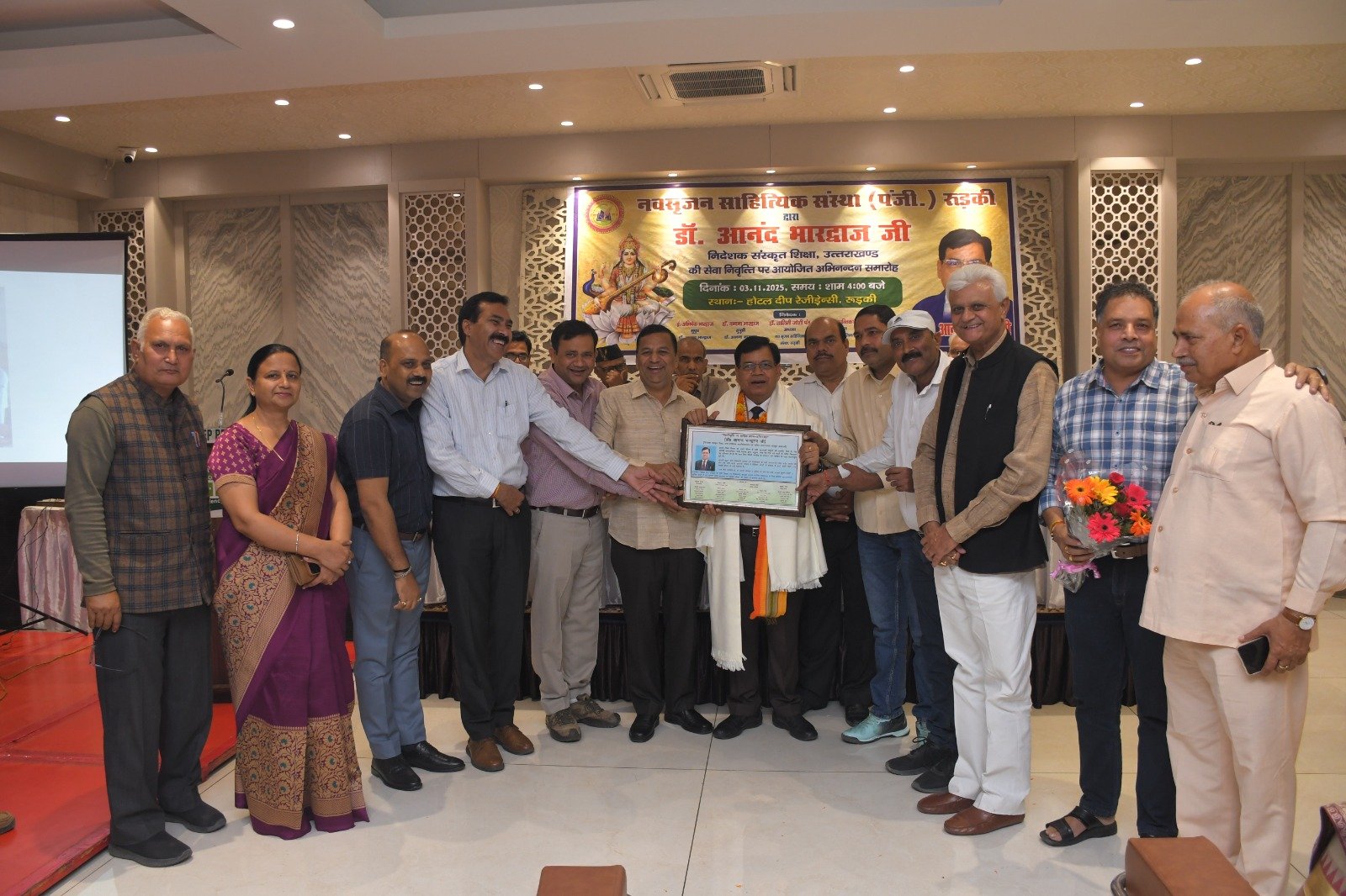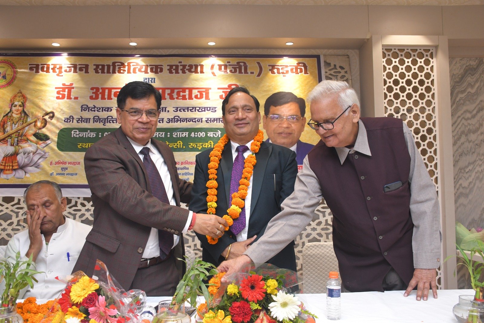 रुड़की। नव सृजन साहित्यिक संस्था रुड़की ने संस्कृत शिक्षा निदेशक पद से सेवानिवृत्त हुए डॉ. आनंद भारद्वाज का अभिनंदन समारोह आयोजित किया, जिसमें शिक्षा जगत के प्रधानाचार्य, प्रवक्ता, शिक्षक तथा विभिन्न शिक्षक संघों से जुड़े पदाधिकारीगण समेत काव्य जगत से जुडे साहित्यकार शामिल रहे। इस कार्यक्रम की अध्यक्षता नगर के वरिष्ठ साहित्यकार सुरेंद्र कुमार सैनी ने की तथा संचालन शायर पंकज त्यागी ‘असीम’ द्वारा किया गया। मुख्य अतिथि के रूप में उत्तराखंड सरकार में राज्य मंत्री श्याम वीर सैनी उपस्थित रहे। मंच पर नवसृजन साहित्यिक संस्था की अध्यक्ष डॉक्टर शालिनी जोशी पंत, झबरेड़ा पैरा मेडिकल कॉलेज के संस्थापक डॉक्टर दिनेश त्रिपाठी, भगवानपुर तथा रुड़की के खंड शिक्षा अधिकारी अभिषेक शुक्ला , शिक्षक नेता डॉ. अनिल शर्मा एवं विक्रमशिला हिंदी विद्यापीठ के उपकुलपति डॉ. श्री गोपाल नारसन उपस्थित रहे। मां सरस्वती की मूर्ति के सम्मुख दीप प्रज्वलन के उपरांत श्रीमती अल्का घनशाला द्वारा सरस्वती वंदना प्रस्तुत की गई। डॉ. आनंद भारद्वाज परिचय डॉ. अनिल शर्मा ने प्रस्तुत किया। उन्होंने बताया कि डॉ. आनंद भारद्वाज ने एक शिक्षक के रूप में अपने कैरियर की शुरुआत करके खंड शिक्षा अधिकारी, जिला मुख्य शिक्षा अधिकारी के पायदानों को छूते हुए अंत निदेशक संस्कृत शिक्षा उत्तराखंड के पदों को शोभायमान किया है। डॉ. श्री गोपाल नारसन ने डॉ. आनंद भारद्वाज के संदर्भ से अपने कुछ मधुर संस्मरणों को साझा किया तथा उन्होंने डॉ भारद्वाज विषयक रचना भी प्रस्तुत की। डॉ. आनंद भारद्वाज की सुपुत्री डॉ. वंदना भारद्वाज ने अपने पिता डॉ आनन्द भारद्वाज के ऊपर बनाई गई एक डॉक्यूमेंट्री फिल्म भी दिखाई गई। संस्था की अध्यक्ष डॉक्टर शालिनी जोशी पंत ने अपनी एक रचना के माध्यम से डॉ. आनंद भारद्वाज के व्यक्तित्व एवं कृतित्व को रेखांकित किया और उनके सुखद भविष्य की कामना की। डाॅं. दिनेश त्रिपाठी व रुड़की तथा भगवानपुर के खंड शिक्षा अधिकारी शुक्ला ने उन्हें एक कुशल एवं सफल अधिकारी बताया। ग़ज़लकार कृष्ण सुकुमार ने डॉ. आनंद भारद्वाज का नवसृजन संस्था को अब तक दिए गए सहयोग एवं मार्गदर्शन के लिए उनका धन्यवाद ज्ञापित किया ।