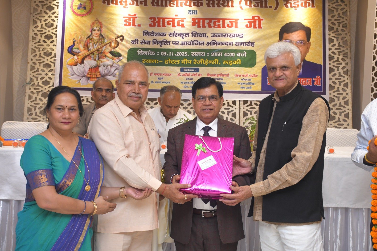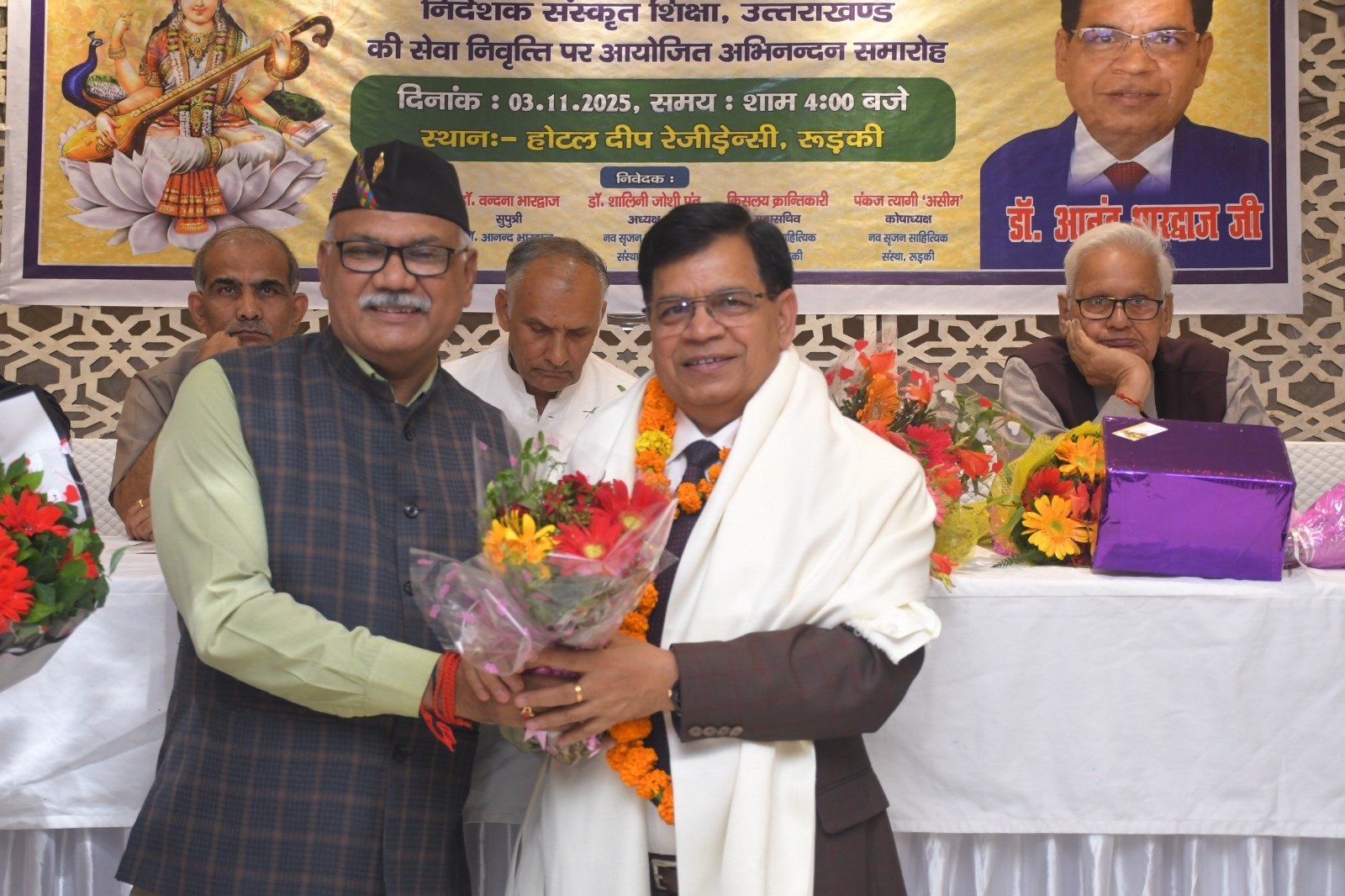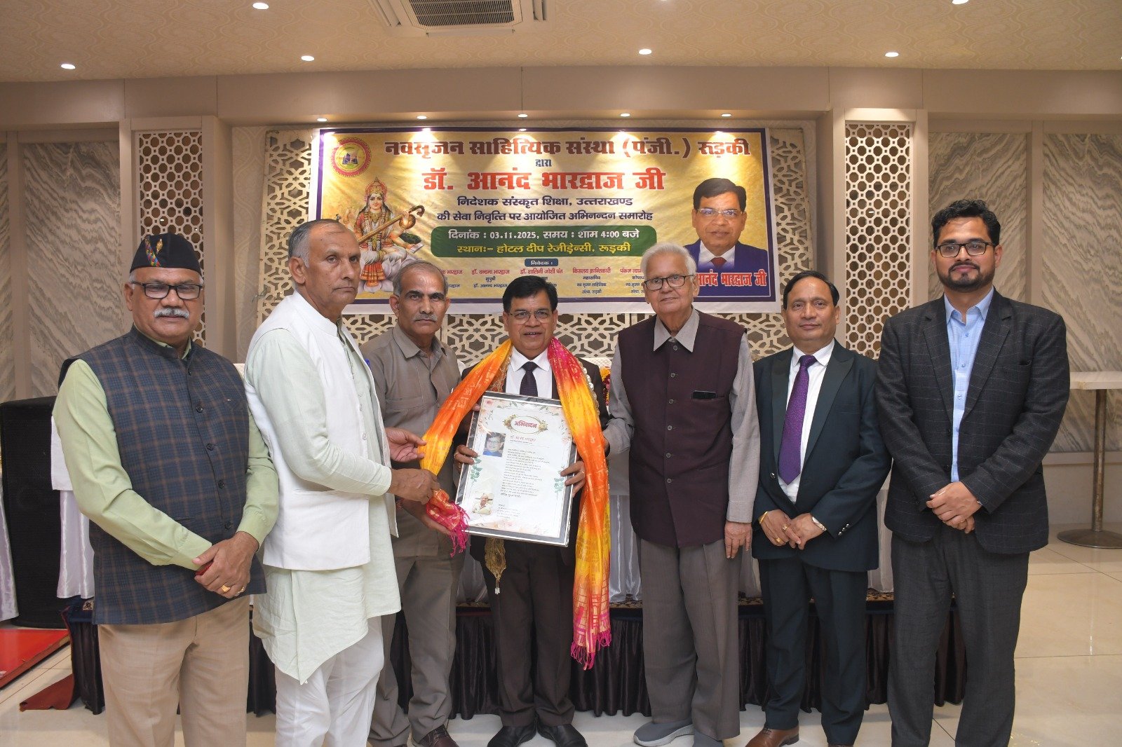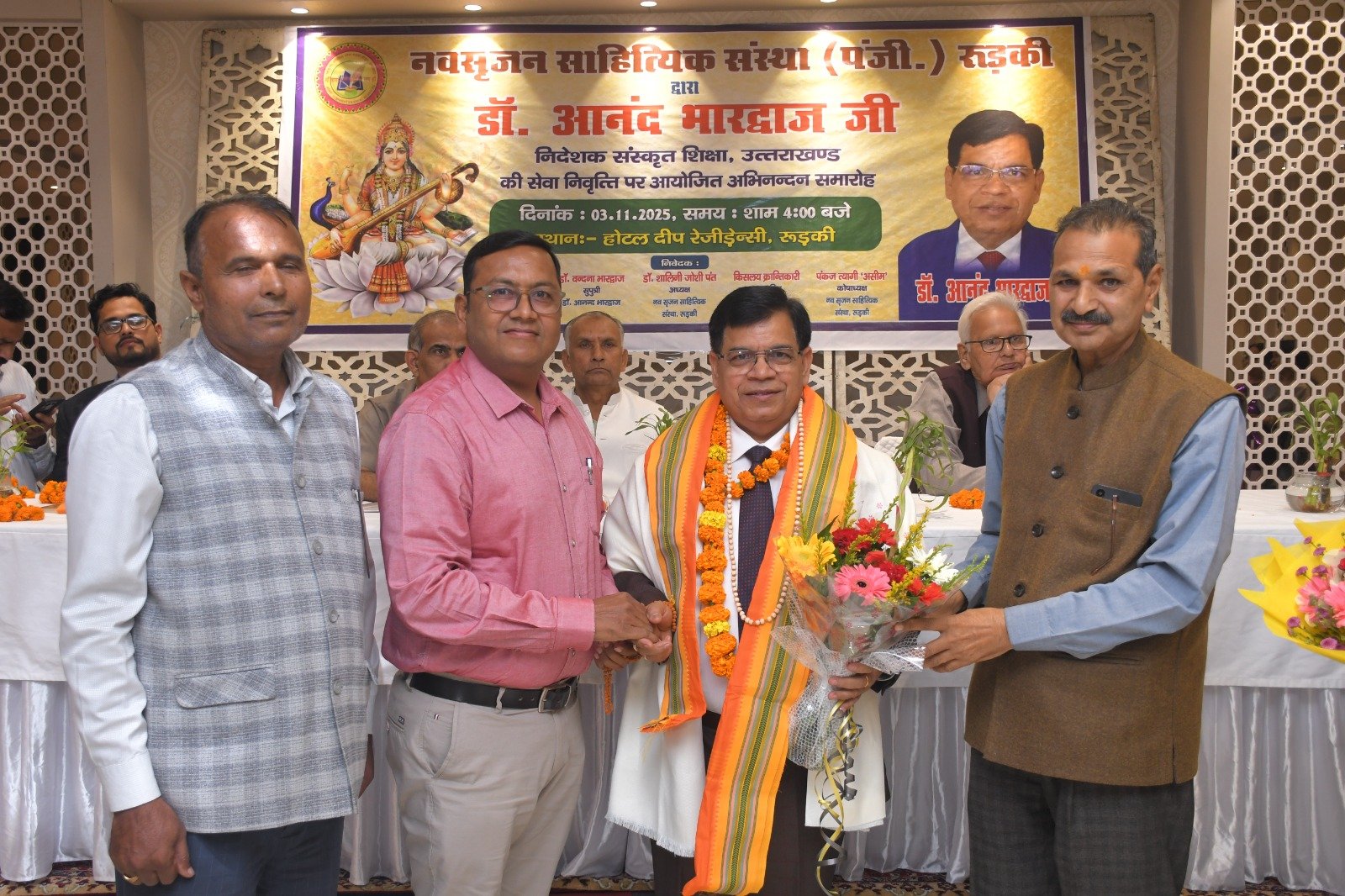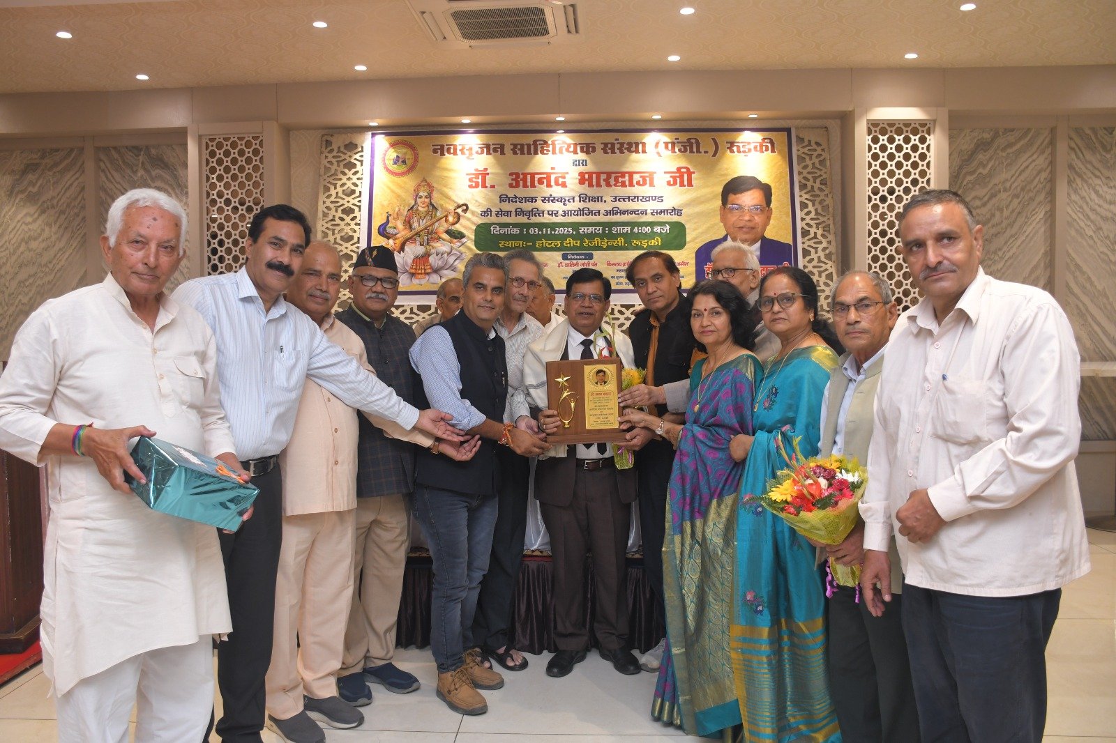 रुड़की। नव सृजन साहित्यिक संस्था रुड़की ने संस्कृत शिक्षा निदेशक पद से सेवानिवृत्त हुए डॉ. आनंद भारद्वाज का अभिनंदन समारोह आयोजित किया, जिसमें शिक्षा जगत के प्रधानाचार्य, प्रवक्ता, शिक्षक तथा विभिन्न शिक्षक संघों से जुड़े पदाधिकारीगण समेत काव्य जगत से जुडे साहित्यकार शामिल रहे। इस कार्यक्रम की अध्यक्षता नगर के वरिष्ठ साहित्यकार सुरेंद्र कुमार सैनी ने की तथा संचालन शायर पंकज त्यागी ‘असीम’ द्वारा किया गया। मुख्य अतिथि के रूप में उत्तराखंड सरकार में राज्य मंत्री श्याम वीर सैनी उपस्थित रहे। मंच पर नवसृजन साहित्यिक संस्था की अध्यक्ष डॉक्टर शालिनी जोशी पंत, झबरेड़ा पैरा मेडिकल कॉलेज के संस्थापक डॉक्टर दिनेश त्रिपाठी, भगवानपुर तथा रुड़की के खंड शिक्षा अधिकारी अभिषेक शुक्ला , शिक्षक नेता डॉ. अनिल शर्मा एवं विक्रमशिला हिंदी विद्यापीठ के उपकुलपति डॉ. श्री गोपाल नारसन उपस्थित रहे। मां सरस्वती की मूर्ति के सम्मुख दीप प्रज्वलन के उपरांत श्रीमती अल्का घनशाला द्वारा सरस्वती वंदना प्रस्तुत की गई। डॉ. आनंद भारद्वाज परिचय डॉ. अनिल शर्मा ने प्रस्तुत किया। उन्होंने बताया कि डॉ. आनंद भारद्वाज ने एक शिक्षक के रूप में अपने कैरियर की शुरुआत करके खंड शिक्षा अधिकारी, जिला मुख्य शिक्षा अधिकारी के पायदानों को छूते हुए अंत निदेशक संस्कृत शिक्षा उत्तराखंड के पदों को शोभायमान किया है। डॉ. श्री गोपाल नारसन ने डॉ. आनंद भारद्वाज के संदर्भ से अपने कुछ मधुर संस्मरणों को साझा किया तथा उन्होंने डॉ भारद्वाज विषयक रचना भी प्रस्तुत की। डॉ. आनंद भारद्वाज की सुपुत्री डॉ. वंदना भारद्वाज ने अपने पिता डॉ आनन्द भारद्वाज के ऊपर बनाई गई एक डॉक्यूमेंट्री फिल्म भी दिखाई गई। संस्था की अध्यक्ष डॉक्टर शालिनी जोशी पंत ने अपनी एक रचना के माध्यम से डॉ. आनंद भारद्वाज के व्यक्तित्व एवं कृतित्व को रेखांकित किया और उनके सुखद भविष्य की कामना की। डाॅं. दिनेश त्रिपाठी व रुड़की तथा भगवानपुर के खंड शिक्षा अधिकारी शुक्ला ने उन्हें एक कुशल एवं सफल अधिकारी बताया। ग़ज़लकार कृष्ण सुकुमार ने डॉ. आनंद भारद्वाज का नवसृजन संस्था को अब तक दिए गए सहयोग एवं मार्गदर्शन के लिए उनका धन्यवाद ज्ञापित किया ।