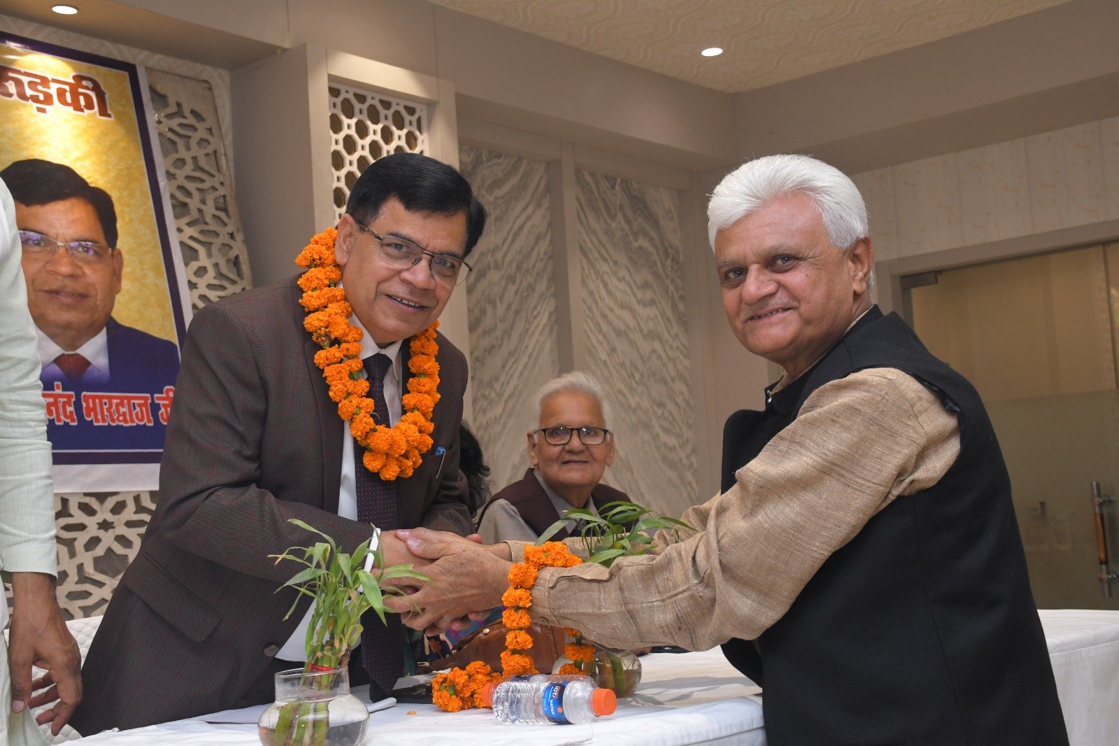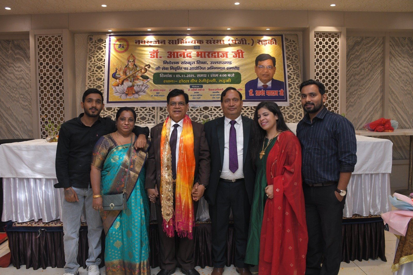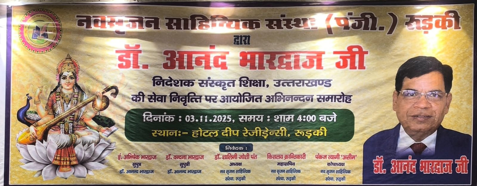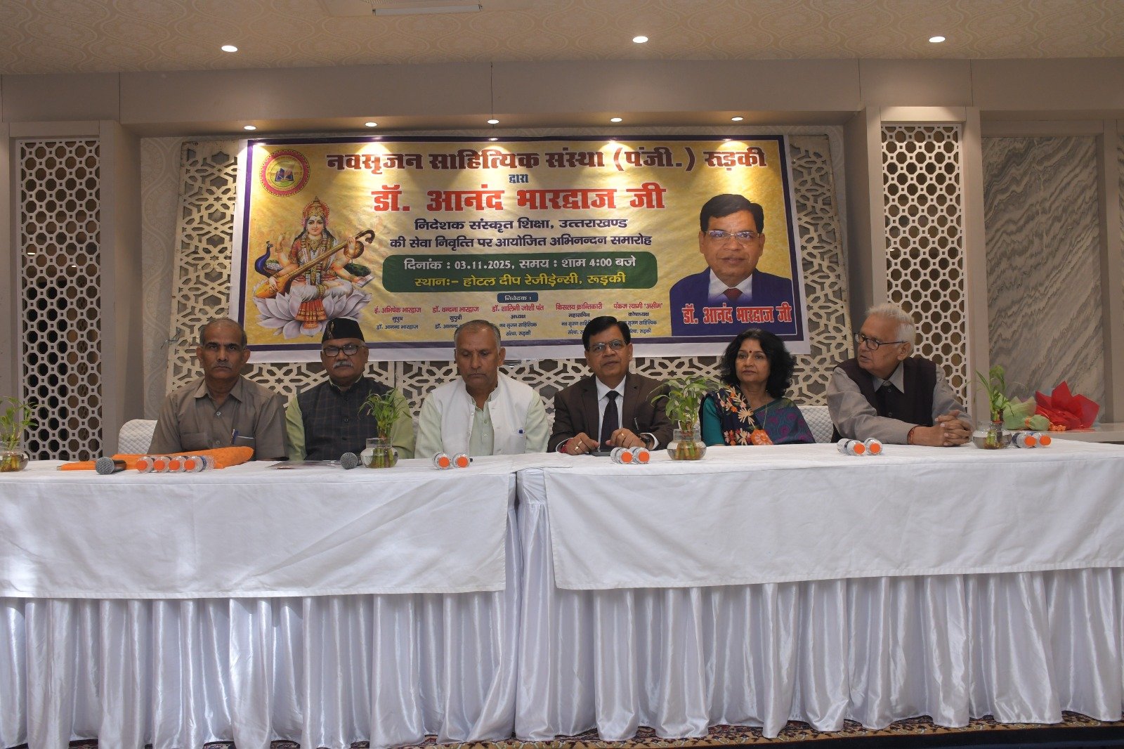 रुड़की। नव सृजन साहित्यिक संस्था रुड़की ने संस्कृत शिक्षा निदेशक पद से सेवानिवृत्त हुए डॉ. आनंद भारद्वाज का अभिनंदन समारोह आयोजित किया, जिसमें शिक्षा जगत के प्रधानाचार्य, प्रवक्ता, शिक्षक तथा विभिन्न शिक्षक संघों से जुड़े पदाधिकारीगण समेत काव्य जगत से जुडे साहित्यकार शामिल रहे। इस कार्यक्रम की अध्यक्षता नगर के वरिष्ठ साहित्यकार सुरेंद्र कुमार सैनी ने की तथा संचालन शायर पंकज त्यागी ‘असीम’ द्वारा किया गया। मुख्य अतिथि के रूप में उत्तराखंड सरकार में राज्य मंत्री श्याम वीर सैनी उपस्थित रहे। मंच पर नवसृजन साहित्यिक संस्था की अध्यक्ष डॉक्टर शालिनी जोशी पंत, झबरेड़ा पैरा मेडिकल कॉलेज के संस्थापक डॉक्टर दिनेश त्रिपाठी, भगवानपुर तथा रुड़की के खंड शिक्षा अधिकारी अभिषेक शुक्ला , शिक्षक नेता डॉ. अनिल शर्मा एवं विक्रमशिला हिंदी विद्यापीठ के उपकुलपति डॉ. श्री गोपाल नारसन उपस्थित रहे। मां सरस्वती की मूर्ति के सम्मुख दीप प्रज्वलन के उपरांत श्रीमती अल्का घनशाला द्वारा सरस्वती वंदना प्रस्तुत की गई। डॉ. आनंद भारद्वाज परिचय डॉ. अनिल शर्मा ने प्रस्तुत किया। उन्होंने बताया कि डॉ. आनंद भारद्वाज ने एक शिक्षक के रूप में अपने कैरियर की शुरुआत करके खंड शिक्षा अधिकारी, जिला मुख्य शिक्षा अधिकारी के पायदानों को छूते हुए अंत निदेशक संस्कृत शिक्षा उत्तराखंड के पदों को शोभायमान किया है। डॉ. श्री गोपाल नारसन ने डॉ. आनंद भारद्वाज के संदर्भ से अपने कुछ मधुर संस्मरणों को साझा किया तथा उन्होंने डॉ भारद्वाज विषयक रचना भी प्रस्तुत की। डॉ. आनंद भारद्वाज की सुपुत्री डॉ. वंदना भारद्वाज ने अपने पिता डॉ आनन्द भारद्वाज के ऊपर बनाई गई एक डॉक्यूमेंट्री फिल्म भी दिखाई गई। संस्था की अध्यक्ष डॉक्टर शालिनी जोशी पंत ने अपनी एक रचना के माध्यम से डॉ. आनंद भारद्वाज के व्यक्तित्व एवं कृतित्व को रेखांकित किया और उनके सुखद भविष्य की कामना की। डाॅं. दिनेश त्रिपाठी व रुड़की तथा भगवानपुर के खंड शिक्षा अधिकारी शुक्ला ने उन्हें एक कुशल एवं सफल अधिकारी बताया। ग़ज़लकार कृष्ण सुकुमार ने डॉ. आनंद भारद्वाज का नवसृजन संस्था को अब तक दिए गए सहयोग एवं मार्गदर्शन के लिए उनका धन्यवाद ज्ञापित किया ।