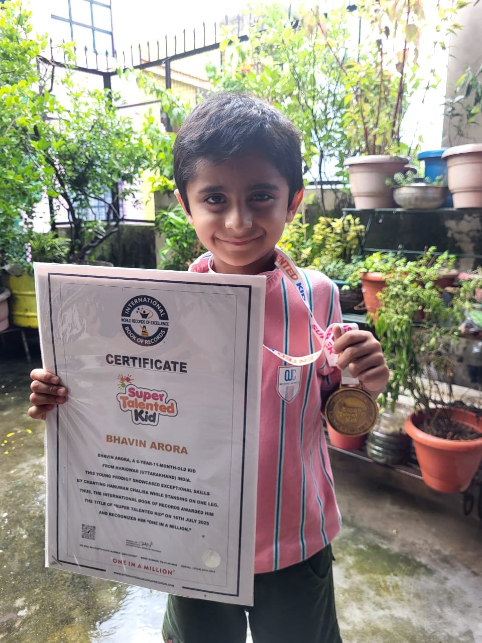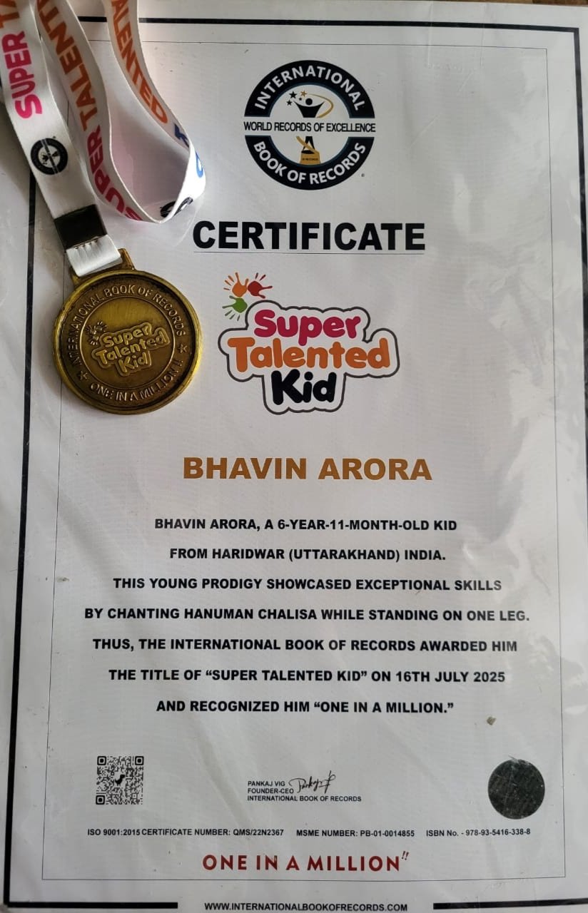 हरिद्वार । डीएवी सेंटेनरी पब्लिक स्कूल कनखल के कक्षा दो के छात्र ने सुपर टैलेंटेड किड का रिकॉर्ड अपने नाम किया है। मात्र 6 वर्ष 11 महीने की आयु में भाविन अरोड़ा ने एक पैर पर खड़े होकर 1 मिनट 7 सेकंड में हनुमान चालीसा का जाप किया। भाविन ने यह उपलब्धि हासिल कर सुपर टैलेंटेड किड का रिकॉर्ड ब्रेक किया। इसी के साथ भाविन अरोड़ा गिनीज बुक ऑफ़ वर्ल्ड रिकॉर्ड में नाम दर्ज कराने के लिए तैयारी कर रहा है।