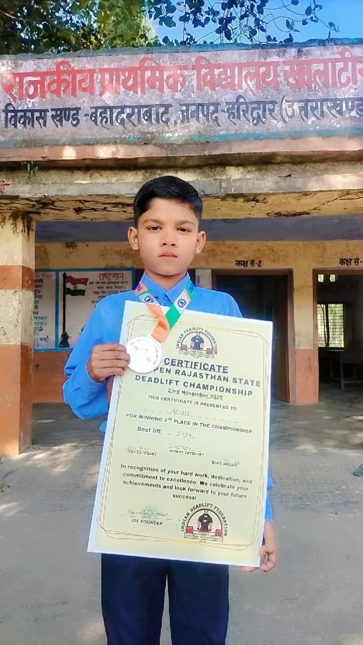 हरिद्वार। विकासखंड बहादराबाद के राजकीय प्राथमिक विद्यालय खालाटीरा के छात्र ने राजस्थान में आयोजित वेट लिफ्टिंग प्रतियोगिता में दूसरा स्थान प्राप्त किया है।
