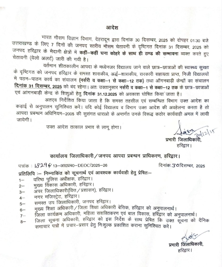 वर्तमान शीतकालीन आपदा के मद्देनजर विद्यालयों जाने वाले छात्र-छात्राओं की सुरक्षा के दृष्टिगत दिनांक 31 दिसम्बर, 2025 को जनपद हरिद्वार के समस्त ऑगनबाड़ी केन्द्र, शासकीय, अर्द्ध-शासकीय, सरकारी सहायता प्राप्त एवं निजी विद्यालयों में कक्षा 1 से कक्षा-12 तक के छात्र-छात्राओं हेतु अवकाश घोषित किया जाता है।