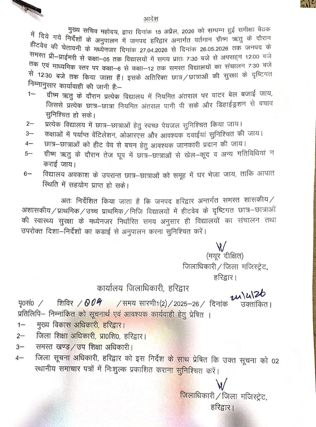जनपद हरिद्वार में भीषण गर्मी और हीट वेव की चेतावनी को देखते हुए जिला प्रशासन ने बड़ा फैसला लिया है। जिलाधिकारी मयूर दीक्षित के आदेशानुसार अब 27 अप्रैल से 26 मई 2026 तक सभी विद्यालयों का समय बदल दिया गया है।